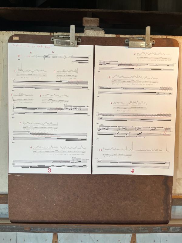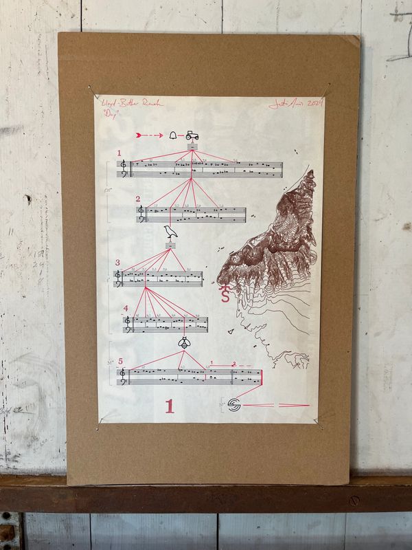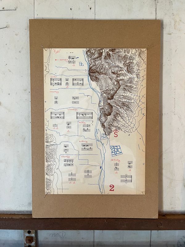 This work came about as a commission from Studio Channel Islands in Camarillo California and the Lloyd-Butler Ranch near Saticoy, California. The work consists of field recordings, archival recordings, topographic maps, and new music for a 150 year old pump organ (since lost in the Mountain Fire of 2024). The scores are printed using a pen plotter on vintage crate labels.